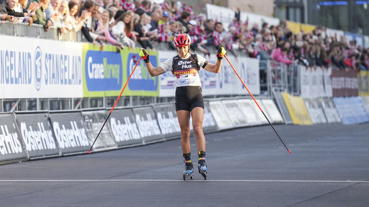 Tout sourire, la gagnante de la coupe du monde va remporter ce mass-start avec quelques secondes d'avance.
